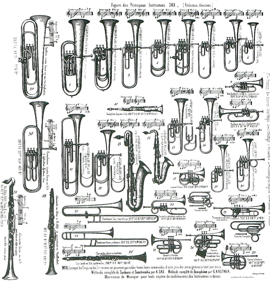 Detalle del catálogo de Adolphe Sax (familia de saxhorns en la parte superior).
